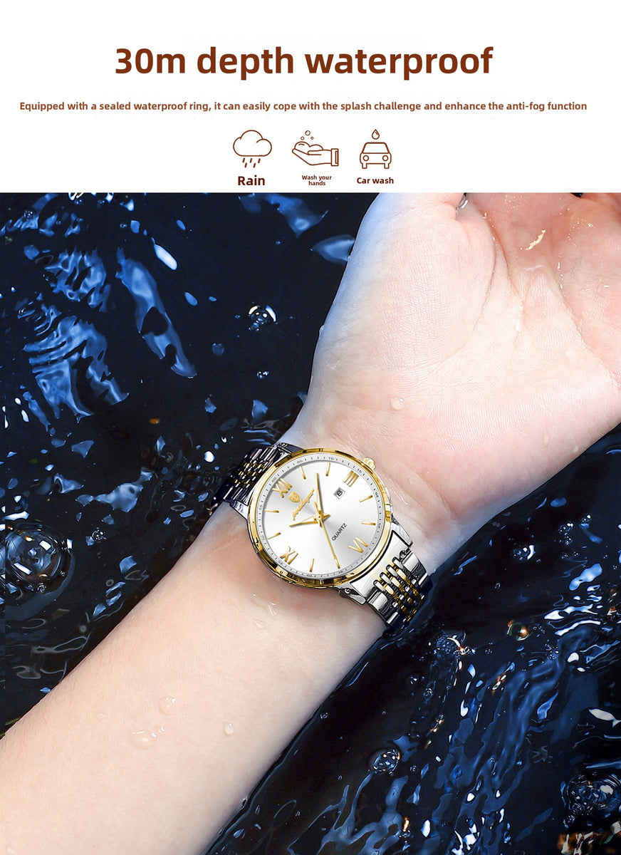 The quartz battery typically lasts between 1–2 years, depending on usage. It can be easily replaced at any watch repair shop.